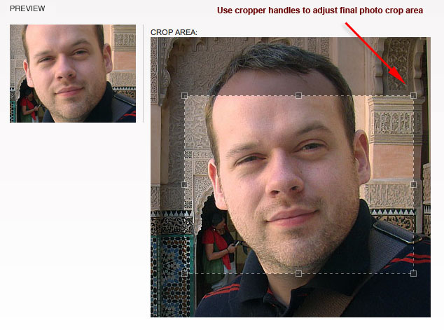 You can upload a photo and crop it to the default size and shape by grabbing the cropping tool handles and adjusting to your preference. You'll see a preview of the cropped photo to the left of the cropping area. You'll want to make sure the original image you upload is at least the size of the default image (180px by 140px).