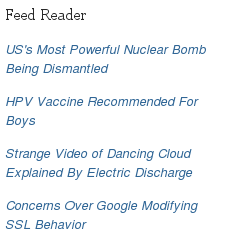 OpenScholar's Feeds feature lets you to subscribe to RSS Feeds from other sites and include the results on your own. This widget allows you to put those results into a box in any region of your site. This box can display any or all of the feeds you've already added to your site.